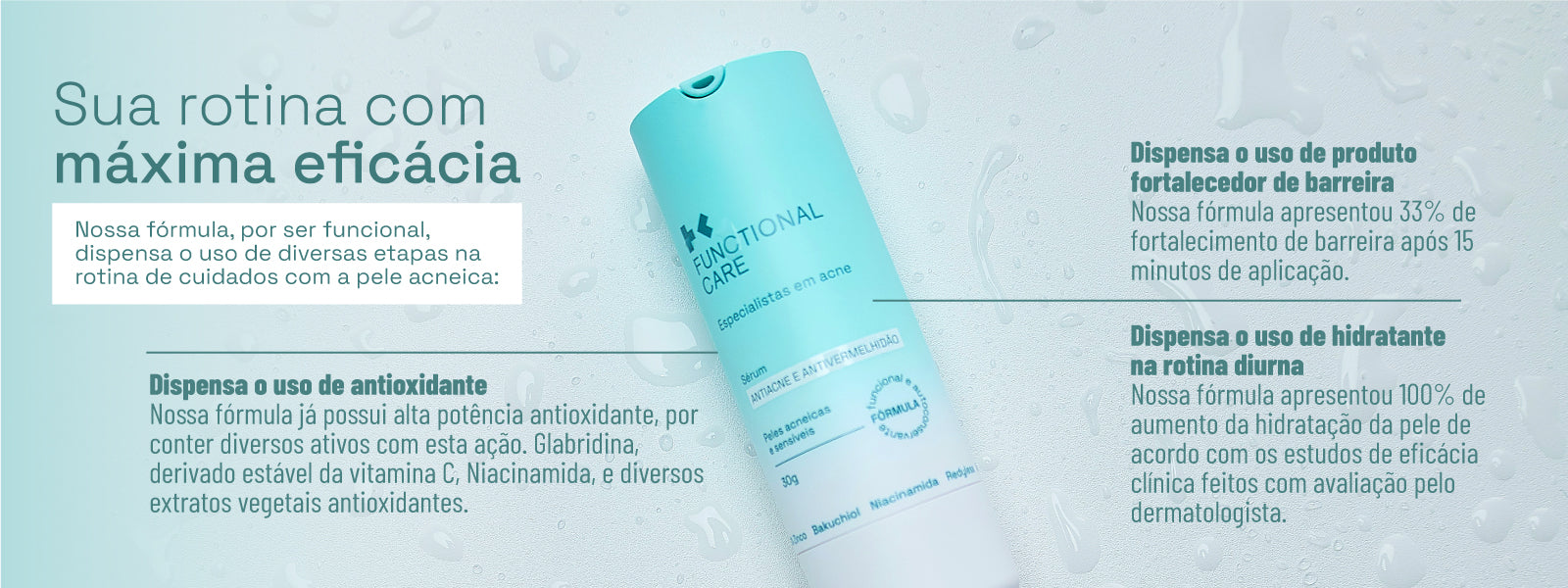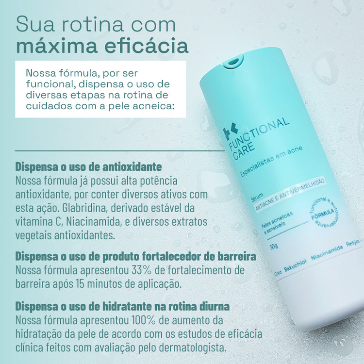 O Sérum Antiacne e Antivermelhidão da Functional Care é uma fórmula com 82% de ativos e que possui a tecnologia funcional, criada especialmente para peles acneicas e sensíveis. Desenvolvido por cientistas que entendem profundamente cada desafio da pele com acne, esse sérum age diretamente na inflamação, controla a produção de sebo e equilibra o microbioma da pele, prevenindo cravos e espinhas enquanto suaviza a vermelhidão. Sua fórmula funcional, fruto de 7 anos de pesquisas científicas e validada por dermatologistas, oferece máxima eficácia sem sensibilizar, irritar ou descamar a pele, e apresentou eficácia clínica superior ao peróxido de benzoíla. Mais que um produto, é um aliado na sua jornada por uma pele mais forte, saudável e equilibrada.