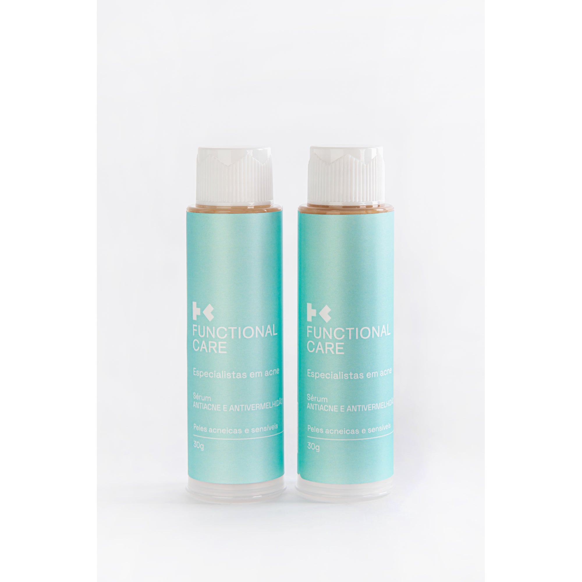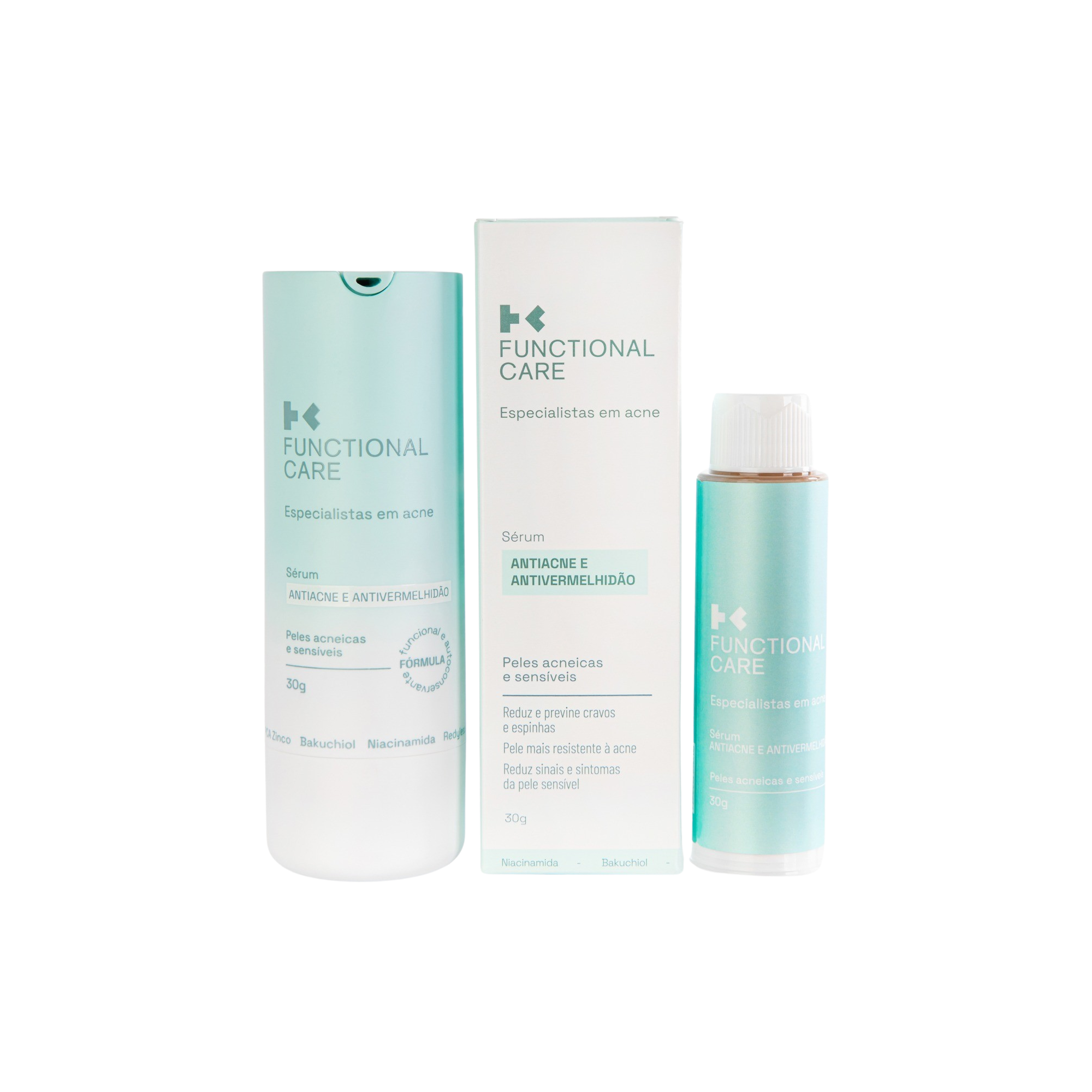 O Sérum Antiacne e Antivermelhidão da Functional Care é uma fórmula com 82% de ativos e que possui a tecnologia funcional, criada especialmente para peles acneicas e sensíveis. Desenvolvido por cientistas que entendem profundamente cada desafio da pele com acne, esse sérum age diretamente na inflamação, controla a produção de sebo e equilibra o microbioma da pele, prevenindo cravos e espinhas enquanto suaviza a vermelhidão. Sua fórmula funcional, fruto de 7 anos de pesquisas científicas e validada por dermatologistas, oferece máxima eficácia sem sensibilizar, irritar ou descamar a pele, e apresentou eficácia clínica superior ao peróxido de benzoíla. Mais que um produto, é um aliado na sua jornada por uma pele mais forte, saudável e equilibrada.