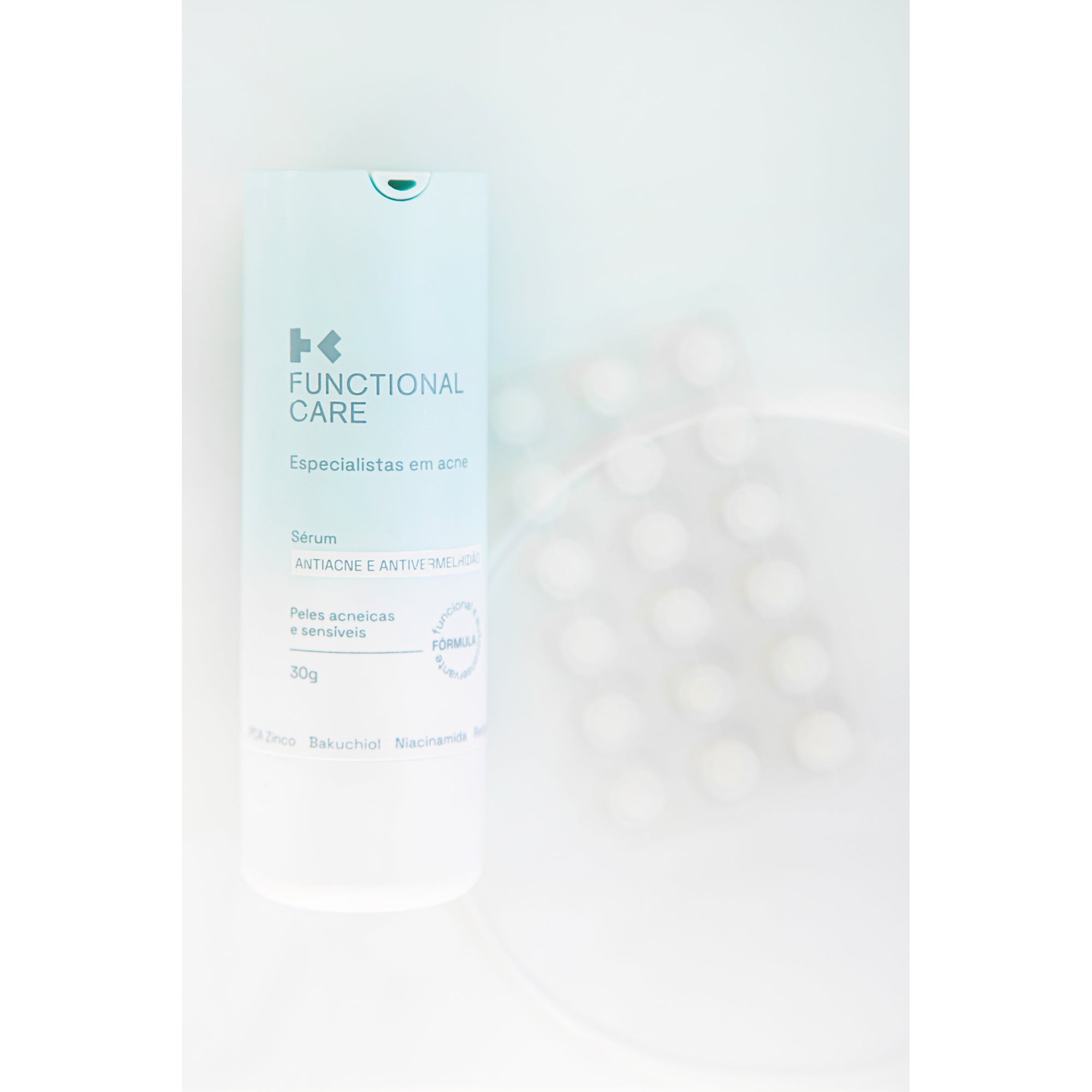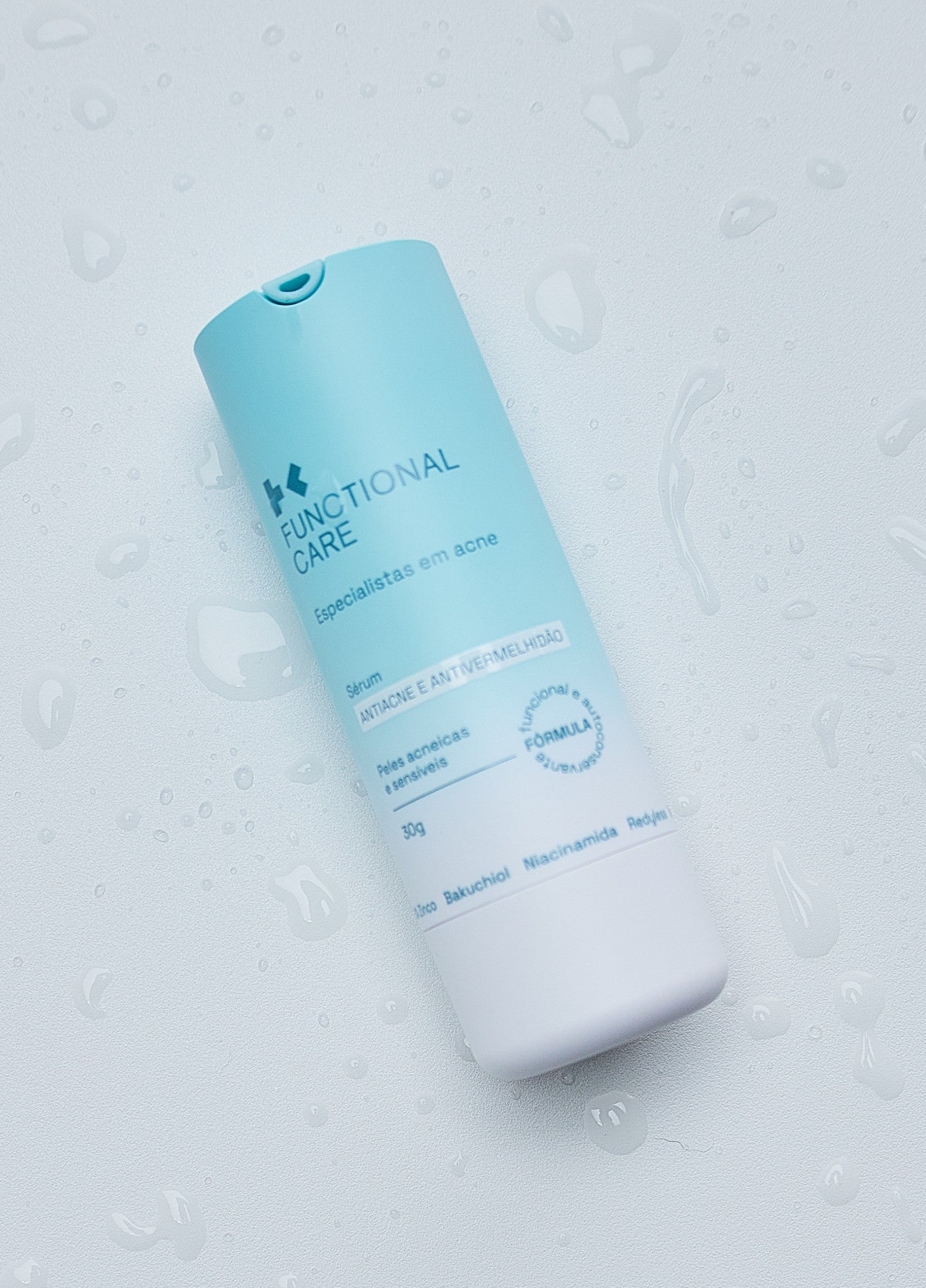 O Sérum Antiacne e Antivermelhidão da Functional Care é uma fórmula com 82% de ativos e que possui a tecnologia funcional, criada especialmente para peles acneicas e sensíveis. Desenvolvido por cientistas que entendem profundamente cada desafio da pele com acne, esse sérum age diretamente na inflamação, controla a produção de sebo e equilibra o microbioma da pele, prevenindo cravos e espinhas enquanto suaviza a vermelhidão. Sua fórmula funcional, fruto de 7 anos de pesquisas científicas e validada por dermatologistas, oferece máxima eficácia sem sensibilizar, irritar ou descamar a pele, e apresentou eficácia clínica superior ao peróxido de benzoíla. Mais que um produto, é um aliado na sua jornada por uma pele mais forte, saudável e equilibrada.