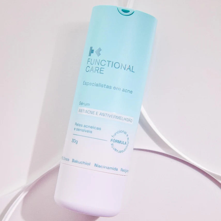 O Sérum Antiacne e Antivermelhidão da Functional Care é uma fórmula com 82% de ativos e que possui a tecnologia funcional, criada especialmente para peles acneicas e sensíveis. Desenvolvido por cientistas que entendem profundamente cada desafio da pele com acne, esse sérum age diretamente na inflamação, controla a produção de sebo e equilibra o microbioma da pele, prevenindo cravos e espinhas enquanto suaviza a vermelhidão. Sua fórmula funcional, fruto de 7 anos de pesquisas científicas e validada por dermatologistas, oferece máxima eficácia sem sensibilizar, irritar ou descamar a pele, e apresentou eficácia clínica superior ao peróxido de benzoíla. Mais que um produto, é um aliado na sua jornada por uma pele mais forte, saudável e equilibrada.