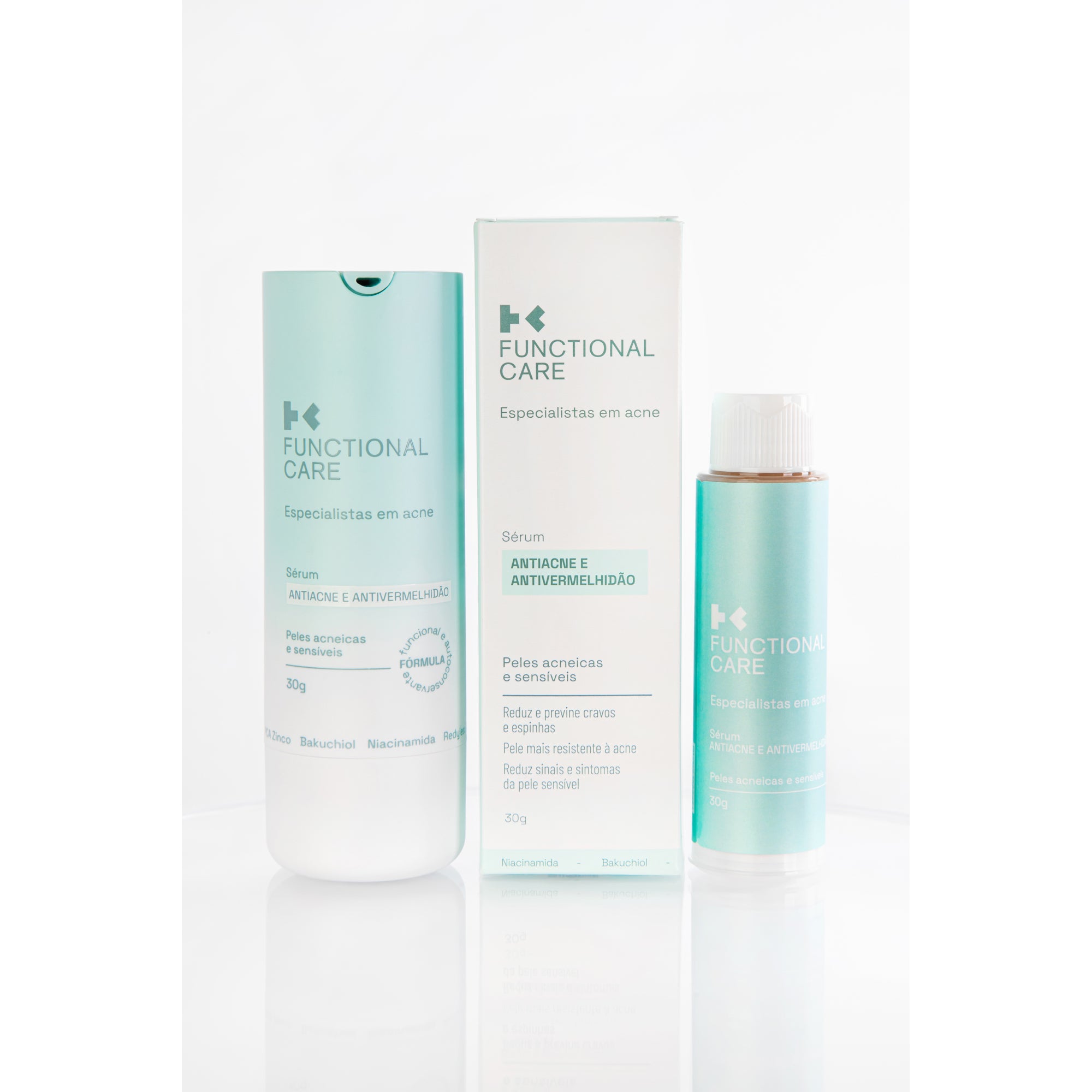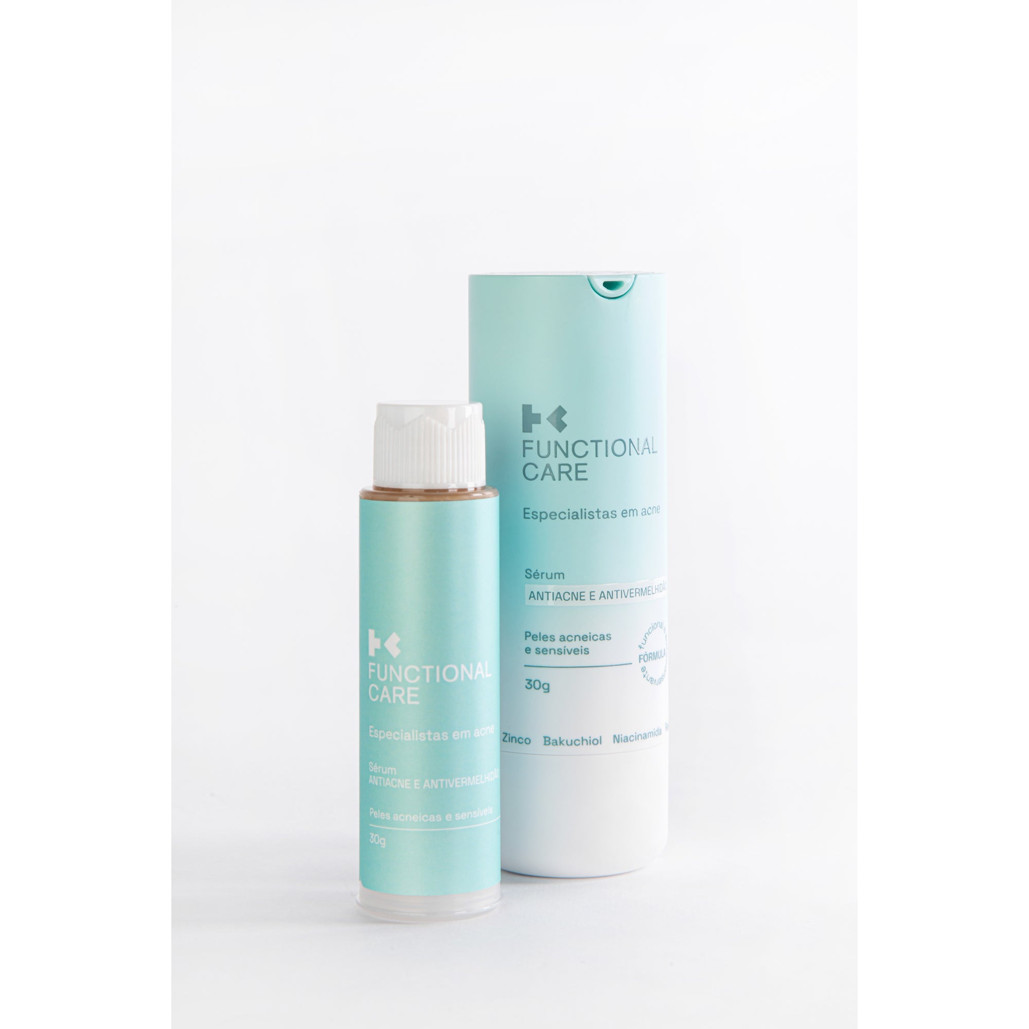O Sérum Antiacne e Antivermelhidão da Functional Care é uma fórmula com 82% de ativos e que possui a tecnologia funcional, criada especialmente para peles acneicas e sensíveis. Desenvolvido por cientistas que entendem profundamente cada desafio da pele com acne, esse sérum age diretamente na inflamação, controla a produção de sebo e equilibra o microbioma da pele, prevenindo cravos e espinhas enquanto suaviza a vermelhidão. Sua fórmula funcional, fruto de 7 anos de pesquisas científicas e validada por dermatologistas, oferece máxima eficácia sem sensibilizar, irritar ou descamar a pele, e apresentou eficácia clínica superior ao peróxido de benzoíla. Mais que um produto, é um aliado na sua jornada por uma pele mais forte, saudável e equilibrada.